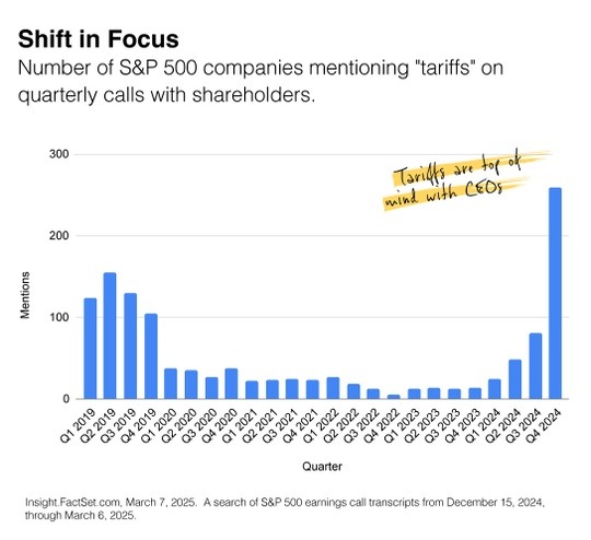 Source: Insight.FactSet.com, March 7, 2025. “Highest Number of S&P 500 Companies Citing 'Tariffs' on Earnings Calls Over the Past 10 years.” |