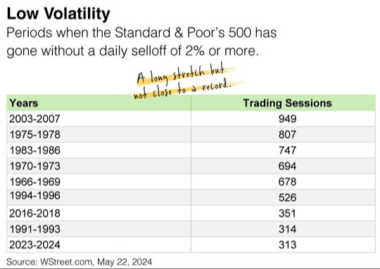 Investors know that the stock market moves in cycles, but the cycle has seen no daily drops of more than 2 percent for over a year. As the accompanying chart shows, the 2023-2024 stretch of low volatility ranks 9th since 1966. Is that cause for alarm? No. Concern? Maybe, but only if you let emotions drive your decision-making.