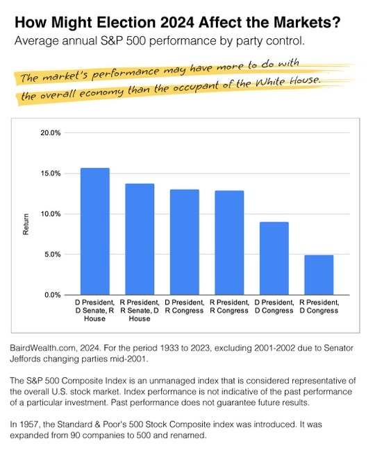 BairdWealth.com, 2024. For the period 1933 to 2023, excluding 2001-2002 due to Senator Jeffords changing parties mid-2001. |