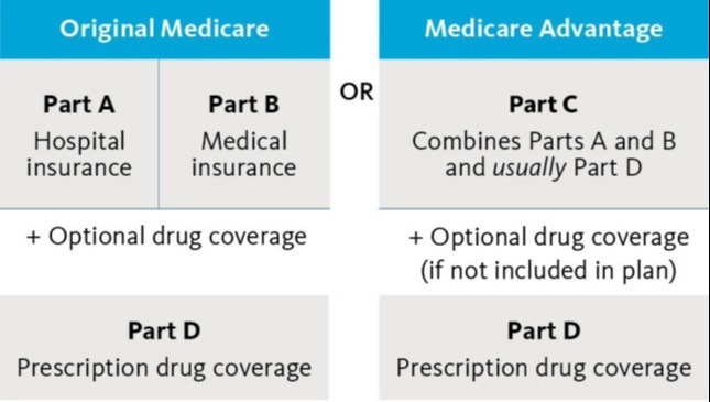Original Medicare is divided into hospital insurance (Part A) and medical insurance (Part B), which are run by the federal government. Medicare Part C (Medicare Advantage) and Part D (prescription drug coverage) are provided by private insurance companies approved by Medicare.