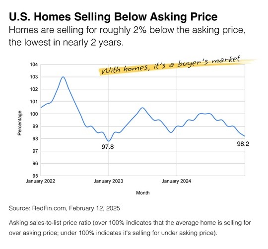 Have you ever heard the expression, “It’s a buyer’s market?” That phrase describes what’s happening with today’s residential real estate: homes are selling for under their asking price and are taking longer to sell. Good news for buyers; not good news for sellers. I’m not a real estate professional, but I do understand that a home is often a critical asset for families. So, I would be remiss if I didn’t periodically update you on real estate trends and statistics. As you can see, homes are selling at nearly 2 percent below the asking price. Perhaps even more concerning, homes are taking 56 days to go under contract–the longest in almost five years. So you may be seeing “for sale” signs up in your neighborhood for longer than you expect.